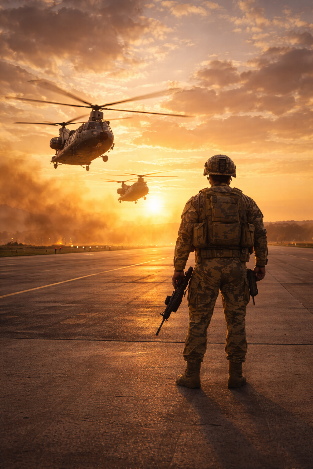 First Light Deployment captures a quiet, powerful moment at dawn — a Marine standing on the runway as helicopters lift into the morning sky. Bathed in the soft golden light of sunrise, this scene reflects resolve, readiness, and the calm strength that comes before action.