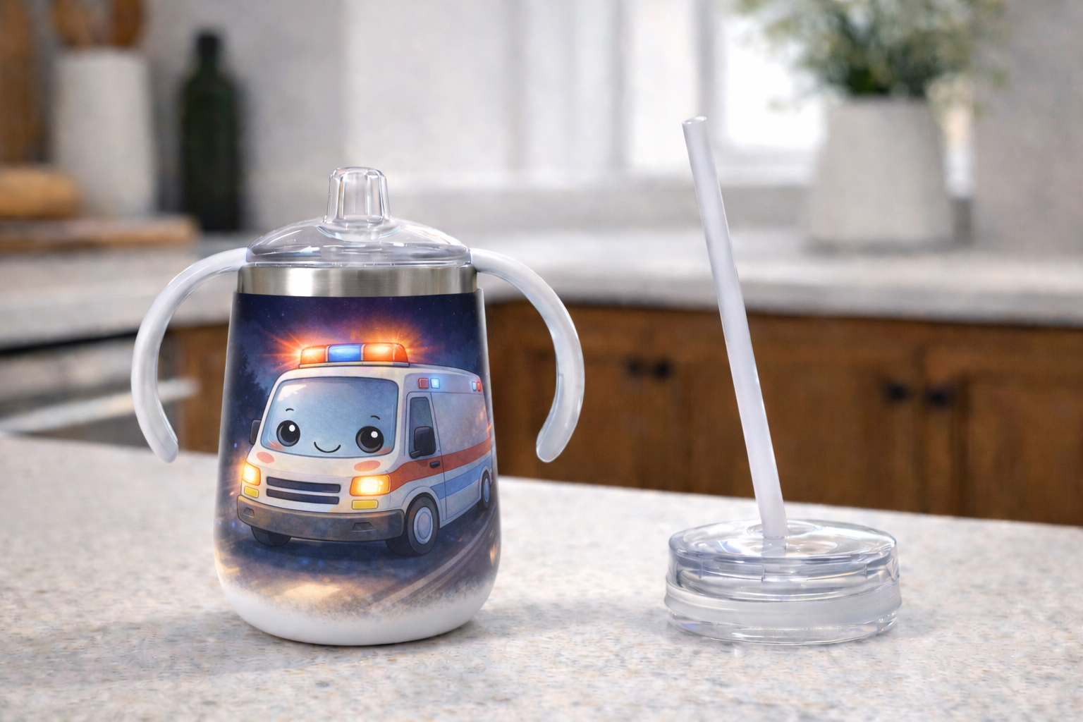 With soft colors and a cheerful expression, this playful artwork turns nighttime helpers into comforting friends. Perfect for bedtime routines, quiet moments, or everyday use, this sippy cup offers reassurance and warmth in little hands.