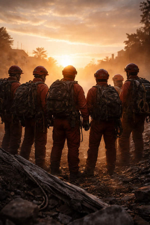 Still Standing Together honors the unity, strength, and quiet resilience of Search & Rescue teams after the mission is complete. Featuring a moving sunrise scene of a rescue team standing side by side in reflection, this design captures the bond formed through shared sacrifice, perseverance, and hope when the work is done and the sun rises again.