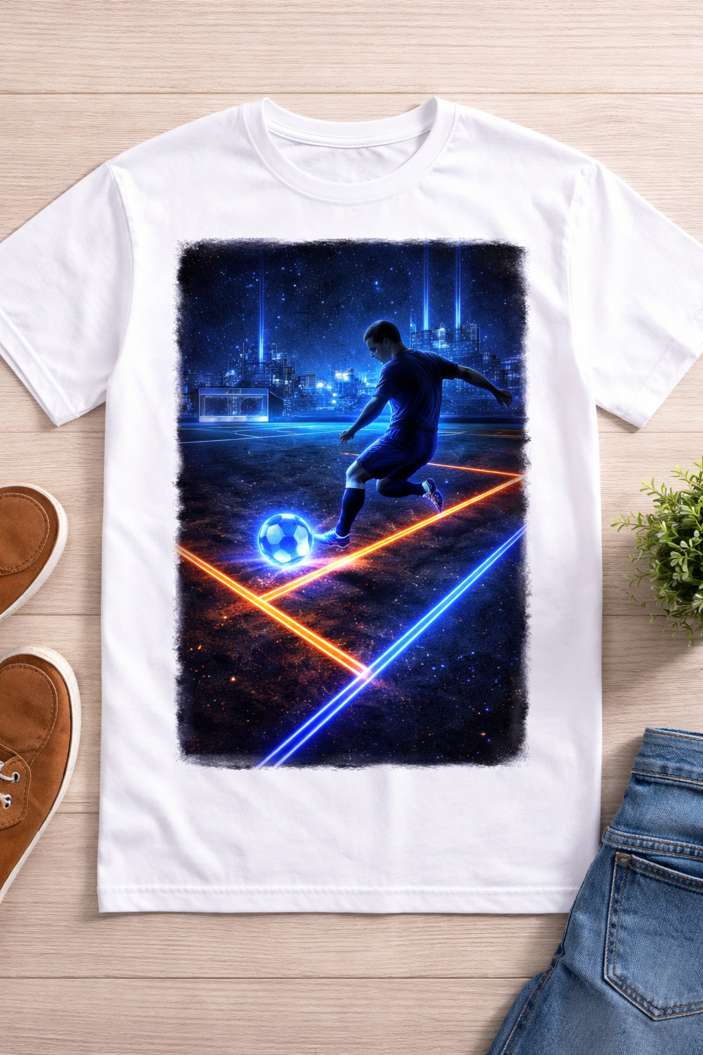The deep blues, bright neon accents, and futuristic city glow create a powerful visual that stands out from every angle. This piece is perfect for those who love soccer with a bold, next-level style.