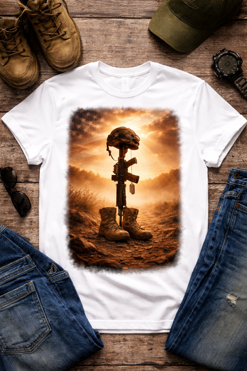 The Fallen But Never Forgotten Sublimation T-Shirt is a heartfelt tribute to the heroes who gave everything in service to our country. Featuring a solemn battlefield memorial scene—a helmet resting on a rifle planted firmly in the ground, with worn boots at its base—this design honors sacrifice, courage, and remembrance.