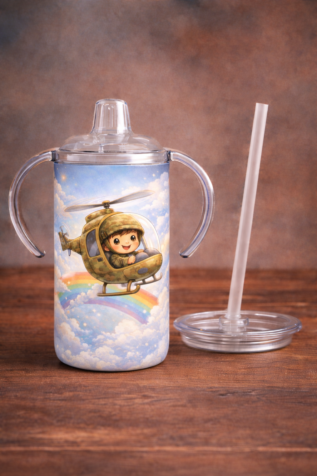 The Future Hero in the Sky 12 oz Sippy Cup is a joyful and inspiring design made for little dreamers with big imaginations. Featuring an adorable cartoon child soldier flying a small helicopter through fluffy clouds and a bright rainbow sky, this design is full of adventure, wonder, and possibility.