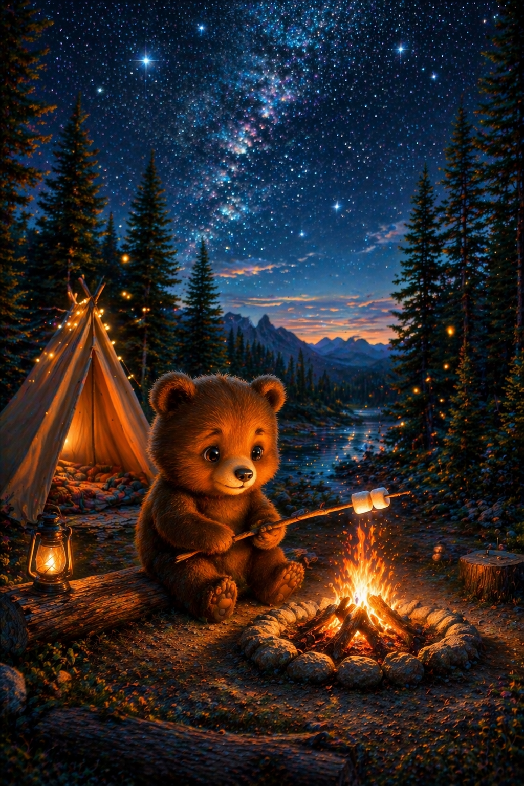Wrap your little one in warmth and wonder with Cozy Bear Campfire Nights. This adorable design features a sweet baby bear sitting by a glowing campfire, roasting marshmallows under a sky full of twinkling stars. Surrounded by gentle pine trees and soft nighttime colors, this cozy scene creates a calm, comforting feeling—perfect for bedtime, snuggles, and peaceful moments.