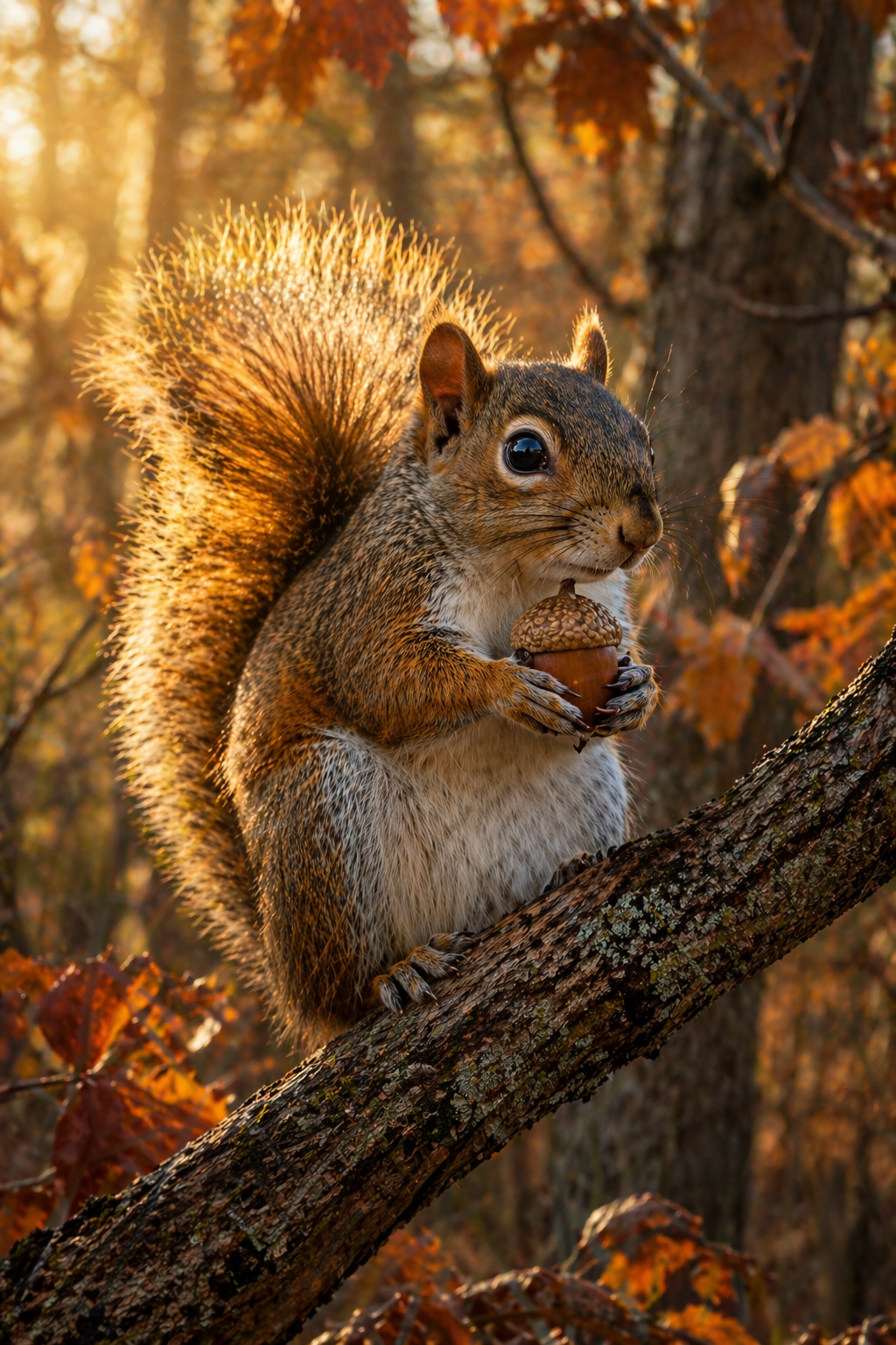 Celebrate the beauty of the season with Autumn Harvest Squirrel. This warm and inviting design captures a detailed squirrel perched on a tree branch, gently holding an acorn as golden autumn light filters through the forest. Surrounded by rich fall tones and soft glowing light, this piece reflects the quiet preparation, provision, and peace found in nature.