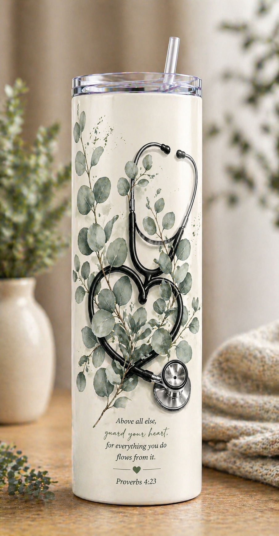 The “Rooted in Care” design beautifully blends the heart of nursing with a calm, elegant botanical style. Featuring a minimalist stethoscope intertwined with soft eucalyptus leaves on a gentle cream background, this tumbler reflects peace, strength, and purpose in every detail.